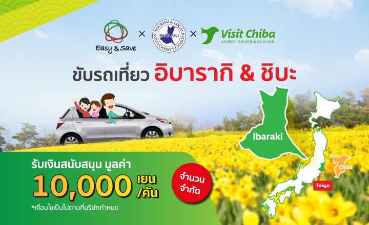 โปรโมชั่นพิเศษสำหรับลูกค้าที่เช่ารถกับ Easy&Save และพักค้างคืนที่จังหวัดอิบารากิ หรือจังหวัดชิบะ 1 คืนขึ้นไป รับเงินสนับสนุนจากจังหวัดอิบากิ และจังหวัดชิบะ 10,000 เยน/คัน **โปรโมชั่นนี้มีจำนวนจำกัด**