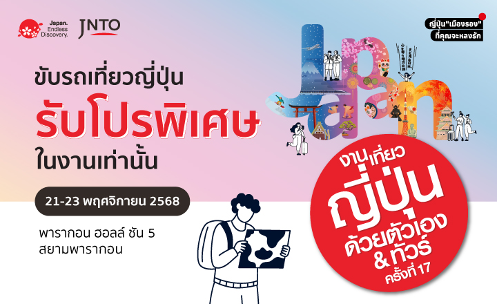 ทราเวลแฟร์เที่ยวญี่ปุ่น ที่ใหญ่ที่สุดในไทย กลับมาแล้ว! ขอเชิญชวนผู้ที่สนใจท่องเที่ยวประเทศญี่ปุ่นแวะมาเยี่ยมชมงาน เที่ยวญี่ปุ่นด้วยตัวเอง & ทัวร์ ครั้งที่ 17 วันที่ 21 - 23 พฤศจิกายน 2568 (ศุกร์ - อาทิตย์) ณ พารากอน ฮอลล์ ชั้น 5 สยามพารากอน เวลา 10.00-20.00 น.