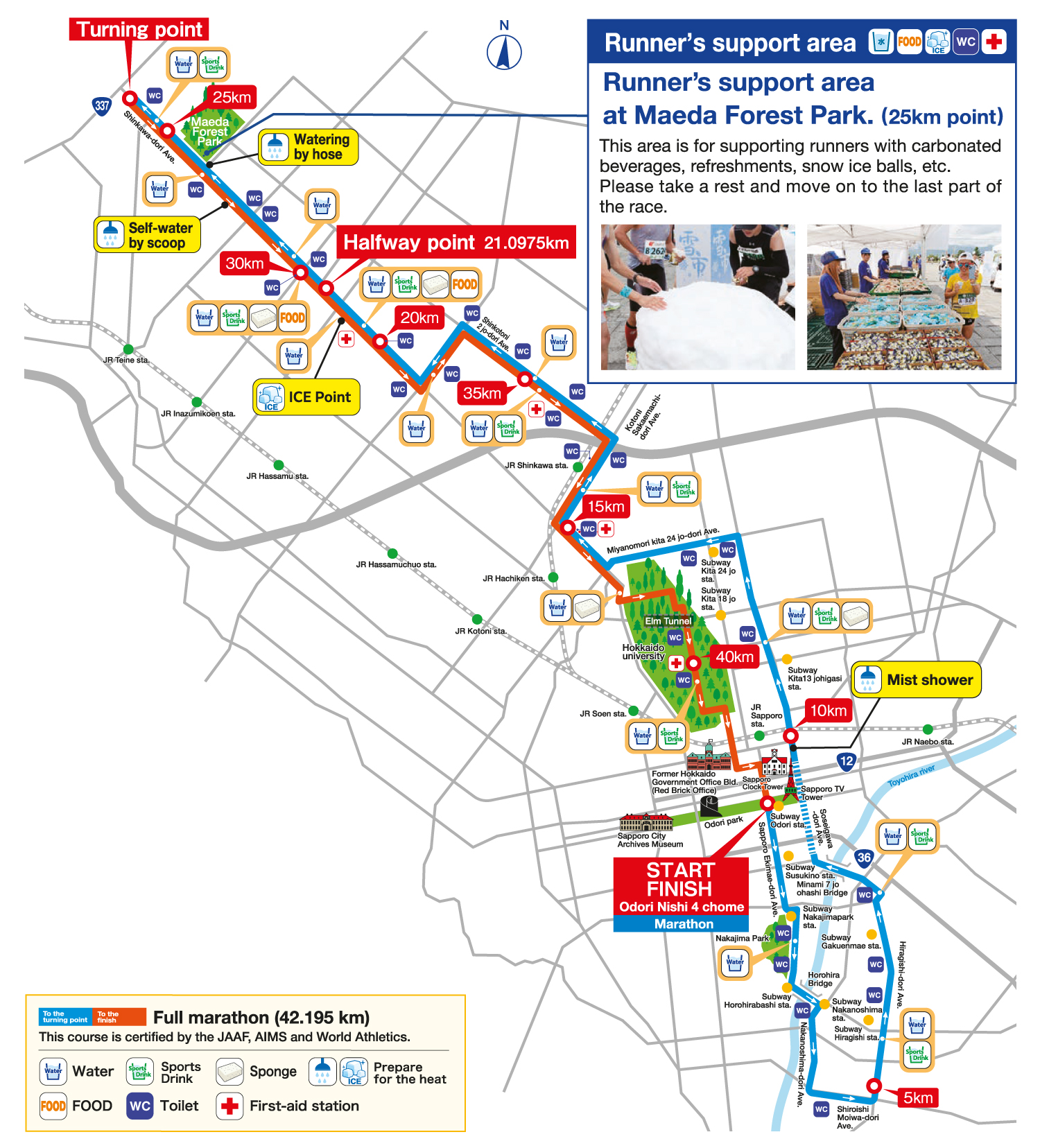 โดยใช้เส้นทางวิ่งจากใจกลางเมือง เริ่มต้นจาก Sapporo TV Tower บริเวณ Odori Park ผ่านสถานที่สำคัญต่างๆในเมืองซัปโปโร ระหว่างทางวิ่งชาวเมืองซัปโปโรจะออกมาส่งเสียงเชียร์ตลอด 2 ข้างทาง